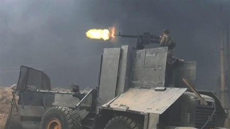 Một tên khủng bố IS ngồi trên xe ủi nã đạn về lực lượng quân đội chính phủ Iraq. Ảnh: Press TV |