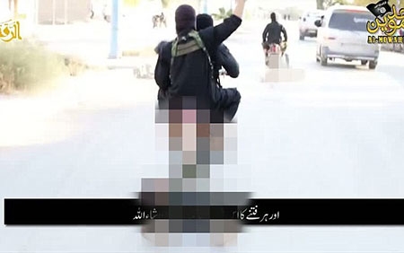 Sau khi đám đông ngưng cuộc hành xác, các tay súng IS buộc xác của 3 lính Syria vào sau xe máy và kéo lê những cái xác trên đường phố Raqqa. Theo sau xe máy, những tay súng và tín đồ hò reo, cổ vũ. |