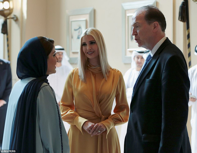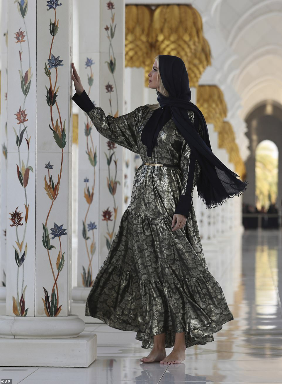 Trước đó vào ngày 15/2, Ivanka Trump cũng đã đến thăm nhà thờ Hồi giáo ở Abu Dhabi. Ivanka Trump xinh đẹp tựa nữ thần với khăn choàng đầu màu đen và chiếc đầm ánh kim thanh lịch. Theo quy định, cô đi chân trần và tìm hiểu về nhà thờ Hồi giáo nổi tiếng này.