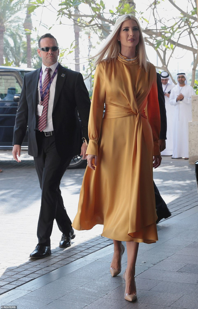 Không chỉ vậy, Ivanka Trump còn thu hút mọi ánh nhìn với gu thời trang tinh tế, thần thái hơn người. Xuất hiện trong sự kiện, con gái Tổng thống Mỹ nổi bật với chiếc đầm vàng sang trọng. Phong thái tự tin của cô khiến Ivanka thêm phần tỏa sáng.