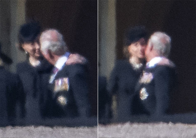 Các bức ảnh được phóng to lên cho thấy Kate quàng tay lên vai Thân vương xứ Wales, hỏi thăm ông. Sau đó, cô hôn lên má ông rồi mới rời đi, để Thái tử Charles và vợ Camilla có không gian riêng sánh bước bên nhau.