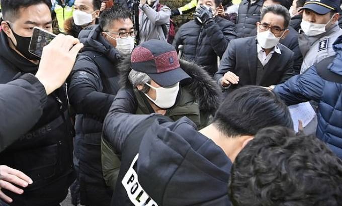 Cho Doo-soon, 69 tuổi, được thả khỏi nhà tù ở phía nam thủ đô Seoul hôm 12/12 sau khi kết thúc 12 năm tù. Cho bị đeo vòng chân điện tử trước khi bị áp giải từ trại giam về nhà ở Ansan.