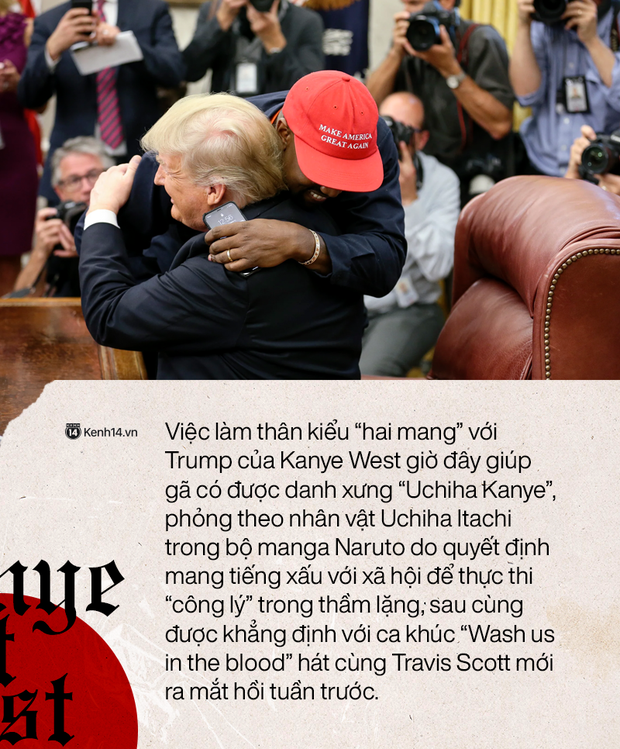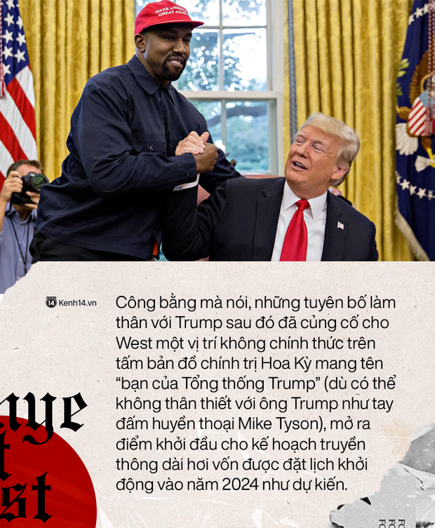 Có nhiều lý do để người ta phỏng đoán về hành động của Kanye West, rằng gã đã hóa điên khi công khai ủng hộ một vị Tổng thống không mấy được lòng cộng đồng người da màu như Donald Trump, hay đây đơn giản chỉ là một chiêu bài đánh bóng tên tuổi thường thấy. Công bằng mà nói, những tuyên bố làm thân với Trump sau đó đã củng cố cho West một vị trí không chính thức trên tấm bản đồ chính trị Hoa Kỳ mang tên “bạn của Tổng thống Trump” (dù có thể không thân thiết với ông Trump như tay đấm huyền thoại Mike Tyson), mở ra điểm khởi đầu cho kế hoạch truyền thông dài hơi vốn được đặt lịch khởi động vào năm 2024 như dự kiến.