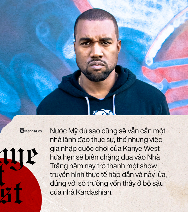 Nước Mỹ dù sao cũng sẽ vẫn cần một nhà lãnh đạo thực sự, thế nhưng việc gia nhập cuộc chơi của Kanye West hứa hẹn sẽ biến chặng đua vào Nhà Trắng năm nay trở thành một show truyền hình thực tế hấp dẫn và nảy lửa, đúng với sở trường vốn thấy ở bộ sậu của nhà Kardashian.