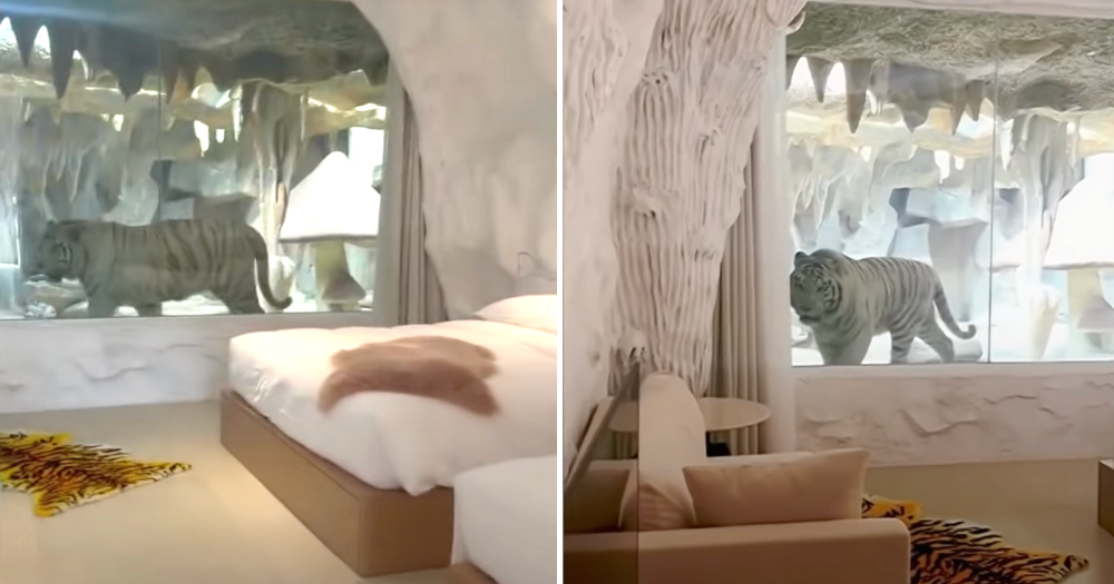 Video do Jimu News đăng tải quảng cáo trải nghiệm phòng khách sạn cho thấy khách thuê phòng có thể nhìn thấy một con hổ trắng đi lại trong khu vực nuôi nhốt gần đó.