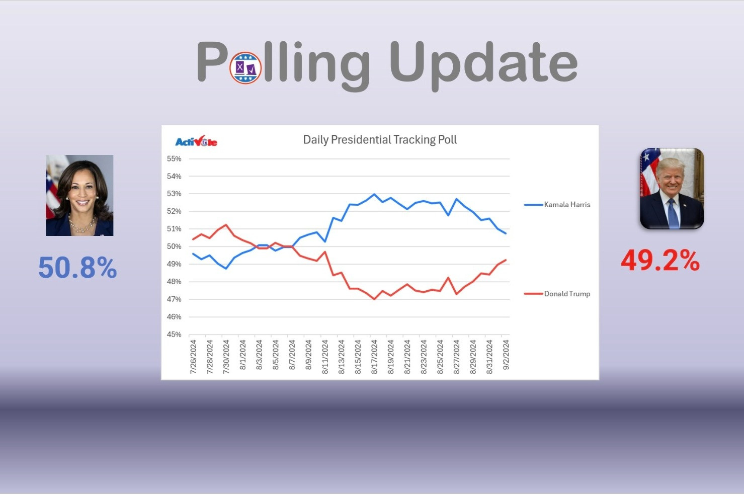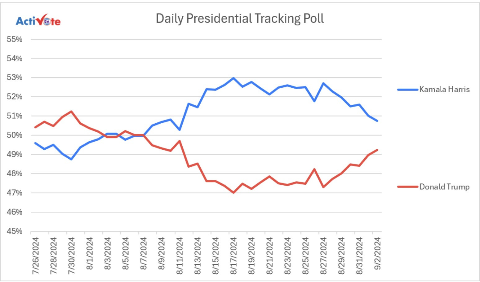 Kết quả một cuộc thăm dò mới của ActiVote, tiến hành từ 25/8 tới 2/9 cho thấy, ứng viên Tổng thống đảng Dân chủ Kamala Harris đang dẫn trước đối thủ Donald Trump 1,6%, với 50,8% ủng hộ so với 49,2% và phạm vi sai số là 3,1%.