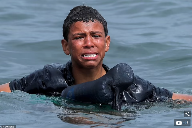 Vào ngày 19/5, hãng Reuters đã chia sẻ hình ảnh và đoạn video đầy ám ảnh về một cậu bé di cư đang tuyệt vọng vật lộn giữa biển nước mênh mông, bơi đến Ceuta, Tây Ban Nha. Cậu bé đã buộc những vỏ chai nhựa lên người để bơi qua biên giới Tây Ban Nha - Maroc.