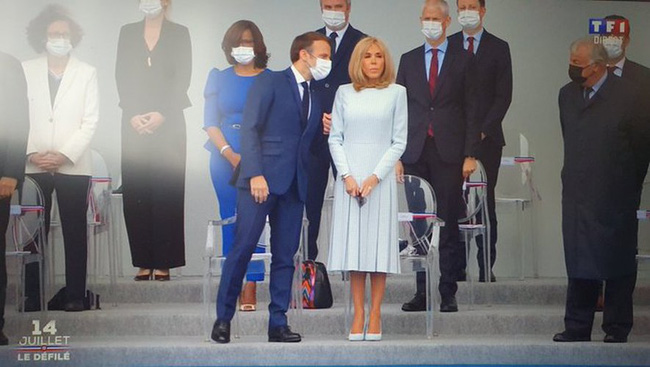 Tuy nhiên, tâm điểm chú ý trong sự kiện này lại chính là bà Brigitte Macron, Đệ nhất phu nhân Pháp. Bà Brigitte Macron đang trở thành chủ đề gây tranh cãi trên trên mạng xã hội khi bà không đeo khẩu trang, tỏ thái độ lạnh lùng không mấy mặn mà với người chồng kém tuổi.