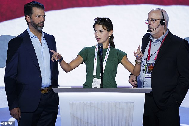 Lần đầu tiên xuất hiện, Kai diện trang phục đơn giản với áo phông xanh rêu kết hợp quần jeans năng động, mái tóc được buộc gọn gàng. Cô nàng gây ấn tượng với vẻ ngoài xinh đẹp, rạng rỡ và chiều cao nổi bật. Hình ảnh hai cha con Kai vui vẻ, sôi nổi kêu gọi ủng hộ ông Trump đã khuấy động bầu không khí tại sự kiện.