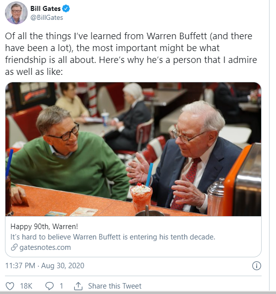Gates viết: "Mặc dù luôn giữ một lịch trình dày đặc, Warren vẫn tìm thấy thời gian để nuôi dưỡng tình bạn như một số ít người khác mà tôi biết". Ông ấy nhấc máy và gọi để chào. Anh ấy thường xuyên gửi những bài báo mà anh ấy đã đọc mà anh ấy nghĩ Melinda hoặc tôi sẽ thấy thú vị ".