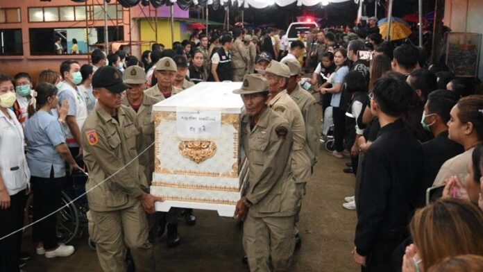 Trước đó, vào 9h30 tối ngày 2 tháng 10 năm 2024 (giờ địa phương), cũng tại trường Wat Khao Phraya Sangkharam, nơi đã được dựng tạm một trung tâm chỉ huy sự cố, đoàn xe đã chở linh cữu người thiệt mạng về từ khoa pháp y bệnh viện.