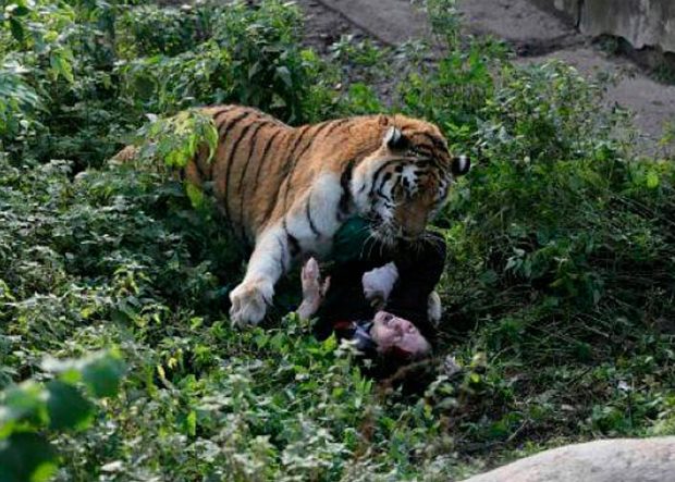 Những bức ảnh ghi lại tại hiện trường cho thấy con hổ đang đứng trên người của nữ nhân viên trẻ với dáng vẻ hung hăn, sẵn sàng đoạt mạng nạn nhân. Trong khi đó, người gặp nạn thì liên tục la hét trong hoảng loạn. Được biết, Taifun chưa bao giờ tấn công nhân viên sở thú nhưng hiện tại, cảnh tượng trước mắt mọi người là con vật đang giơ nanh vuốt, chuẩn bị tấn công nạn nhân.