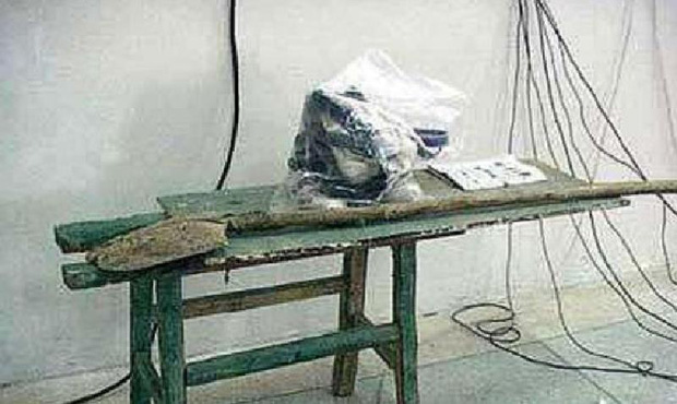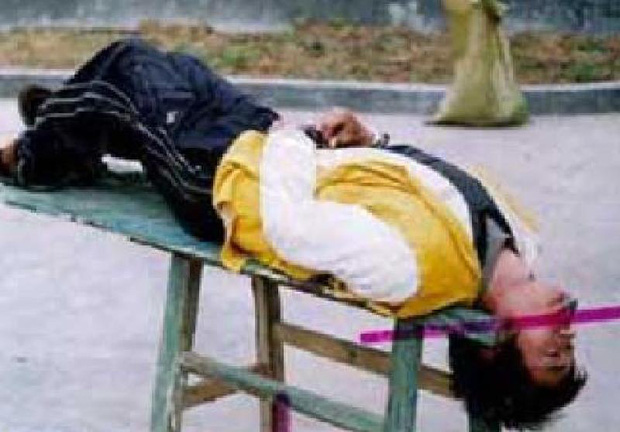 Nói xong Hoàng Dũng biểu diễn một lần cho Vương Bình nhìn, Vương Bình không nghi ngờ gì lập tức nằm lên trên, để đầu kẹp giữa hai thanh gỗ, mặt hướng lên trên, hai tay bị trói lại ở đùi. Đúng lúc này Hoàng Dũng đột nhiên dùng vải trắng siết cổ của Vương Bình, Vương Bình không kịp kêu lên một tiếng đã chết.
