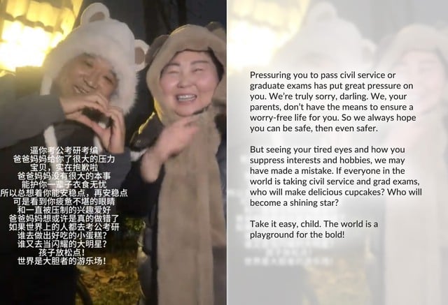 Một đoạn clip gây ấn tượng với Fan nhất là họ đã gửi gắm lời xin lỗi chân thành đến con của họ vì đã gây áp lực buộc con phải cố gắng kiếm được một công việc ổn định, an toàn.