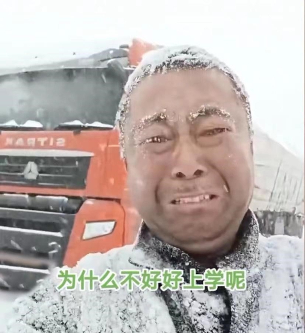Mới đây, một tài xế xe tải ở Nội Mông (Trung Quốc) đã không thể kìm nén cảm xúc khi đang lái xe gặp phải tuyết rơi dày đặc. Đường trơn trượt, xe tải không dám tiến về phía trước. Tài xế mắc kẹt ở nơi vắng vẻ, nhìn tuyết lạnh ập vào mặt, nước mắt hòa mưa tuyết, anh đã bật khóc. Lời tâm sự nghẹn ngào của anh khiến vô số cư dân mạng đau lòng: "Tôi thực sự rất hối hận vì đã không học hành chăm chỉ, kiếp sau nhất định phải nỗ lực học tập".