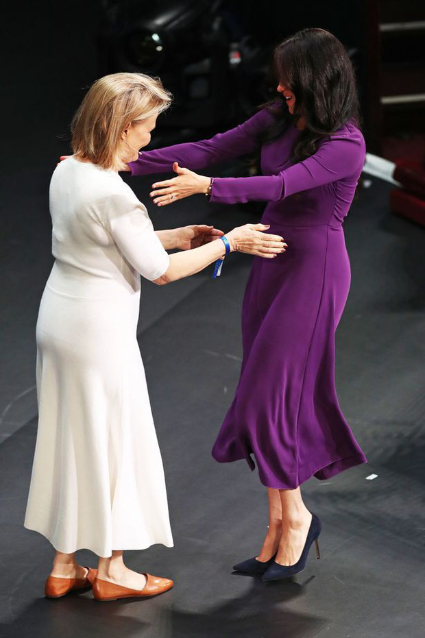 Khi lên sân khấu, Meghan Markle vội vàng ôm chầm lấy Kate Robertson như một người bạn cũ lâu không gặp nhưng người phụ nữ này lại thực hiện nghi thức chào hỏi theo quy tắc hoàng gia. Kết quả là, hai cánh tay của Nữ công tước bắt chéo ôm lấy cổ của người tổ chức chương trình.