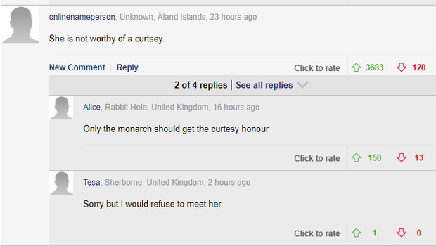 Trong khi đó, một số khác thì cho rằng, mọi người không cần thực hiện nghi thức với Meghan Markle. Trước đó trong bộ phim tài liệu được phát sóng vào tối ngày 20/10, Meghan Markle trải lòng rằng cô đang vật lộn trong gia đình nhà chồng, cô chỉ thấy mình đang tồn tại mà không phải là sống.