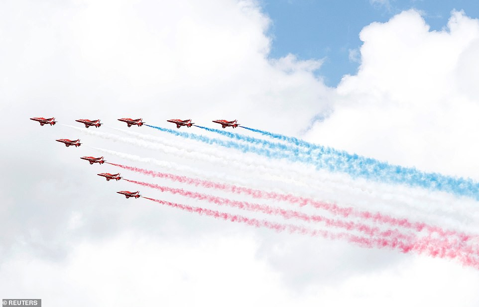 Trong khi chứng kiến màn biểu diễn chúc mừng hoành tráng của phi đội Red Arrows thuộc lực lượng không quân, Hoàng tử Louis không hề tỏ ra sợ hãi mà vô cùng thích thú và phấn khích. Được mẹ bế trên tay, cậu bé 13 tháng tuổi liên tục vẫy bàn tay nhỏ xíu của mình thể hiện sự thích chí khi lần đầu tiên được nhìn thấy màn biểu diễn trên không ấn tượng.