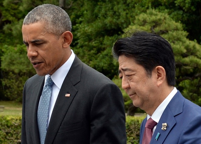 | Thủ tướng Nhật Bản Shinzo Abe trao đổi cùng Tổng thống Mỹ Barack Obama ngày 26/5. Ảnh: Reuters |