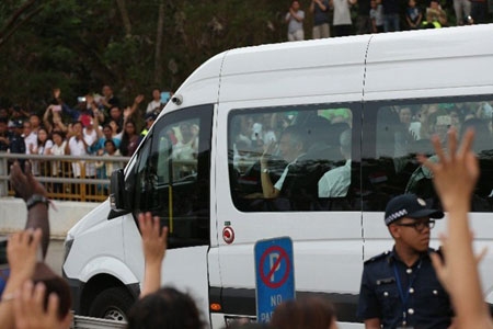 Khoảnh khắc cuối cùng người dân có thể thấy linh cữu của cố thủ tướng Lý Quang Diệu khi đoàn xe đưa linh cữu của ông tới Đài hóa thân Mandai. Ảnh: Strait Times |