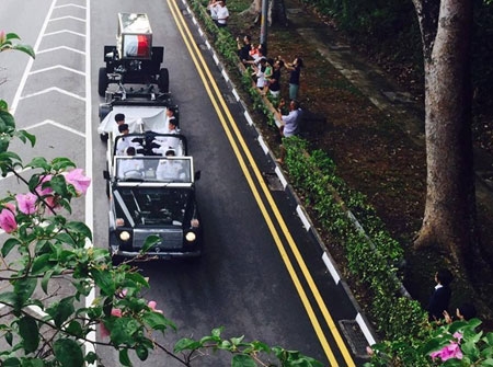 Đoàn xe đưa linh cữu thủ tướng đầu tiên của Singapore đang di chuyển trên đường Upper Thomson, gần tập đoàn Media Corp. Ảnh: Chanel News Asia |