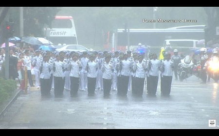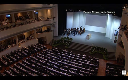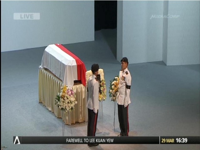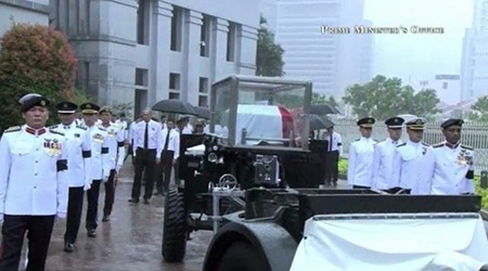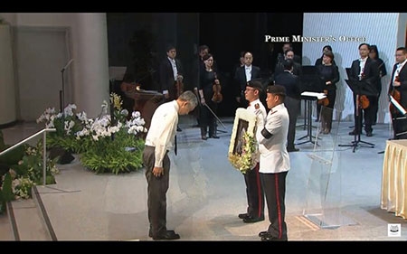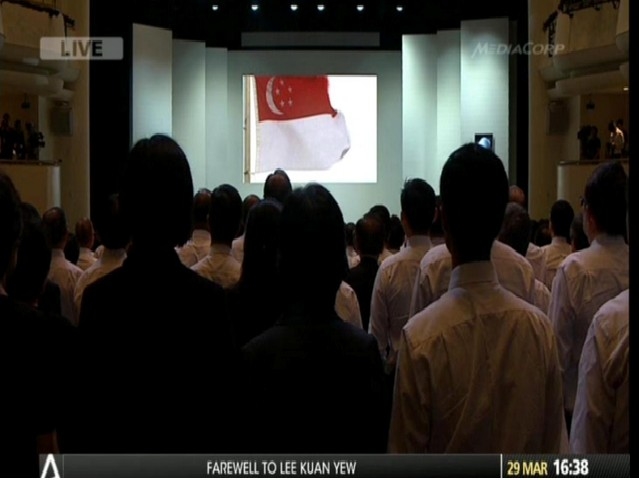 Quốc ca Singapore vang lên trong tang lễ cố Thủ tướng Lý Quang Diệu. Tiếng quốc ca dứt cũng là lúc lễ truy điệu kết thúc. Ảnh: Channel News Asia |