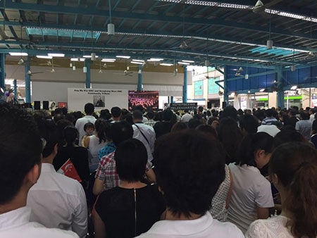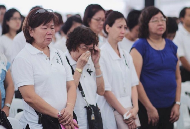 Khoảng 2.000 người theo dõi lễ truy điệu cố thủ tướng Lý Quang Diệu được phát trực tiếp tại Choa Chu Kang. Nhiều người không thể nén cảm xúc trong giây phút mặc niệm. Ảnh: Channel News Asia. |