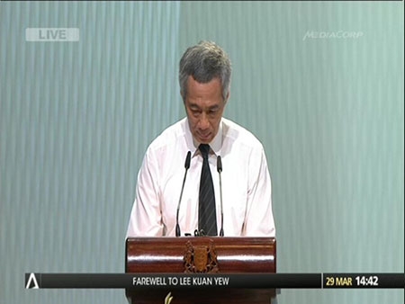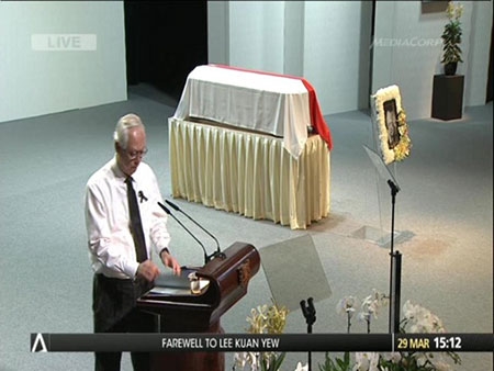 "Cảm ơn ông, Lý Quang Diệu. Xin ông yên nghỉ", Thủ tướng Lý Hiển Long nghẹn ngào nói khi kết thúc bài điều văn.