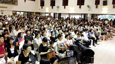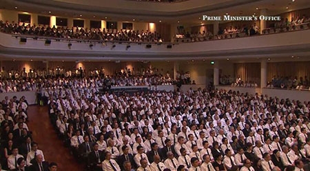 2.200 quan khách trong khán phòng và nhiều người dân Singapore theo dõi trực tiếp ông Lý Hiển Long ca ngợi công lao của thủ tướng đầu tiên của quốc đảo cũng như các kỷ niệm đời thường giữa ông và cha. Ảnh: Straits Times |