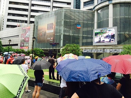 Người dân Singapore tại Hong Kong tập trung tại một căn phòng ở Central Plaza để xem lễ truy điệu cố Thủ tướng Lý Quang Diệu được truyền hình trực tiếp trên TV. Ảnh: Channel News Asia |