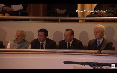 Các lãnh đạo Ấn Độ, Campuchia, Australia và Mỹ lắng nghe bài phát biểu của Thủ tướng Singapore Lý Hiển Long. Ảnh: Straits Times |