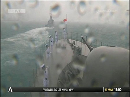 Lễ đưa tiễn ông Lý Quang Diệu cũng diễn ra tại hai tàu hải quân và tàu cảnh sát biển tại đập Marina Barrage. Ở mỗi tàu, các sĩ quan treo cờ đen cùng những lá cơ in những chữ cái L, K, Y (chữ cái đầu tiên trong tên của ông Lý). Ảnh: Channel News Asia |