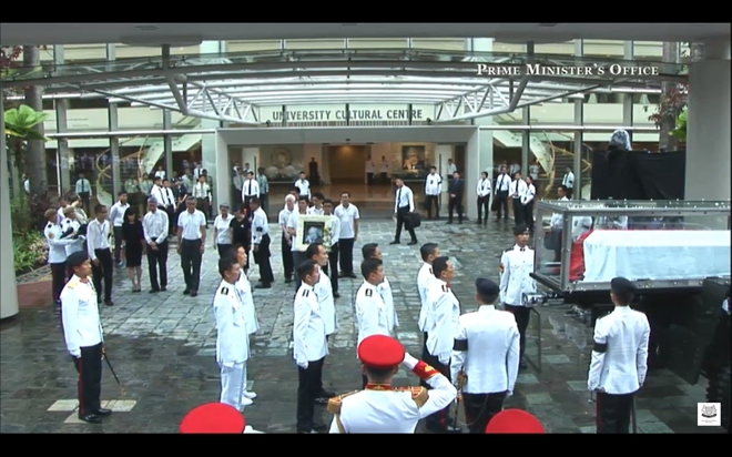 Xe pháo chở linh cữu cố thủ tướng vừa tới cổng Trung tâm Văn hóa Đại học Singapore - nơi lễ an táng ông Lý diễn ra vào 14h (13h Hà Nội). Ảnh: Channel News Asia |