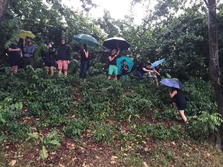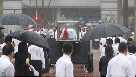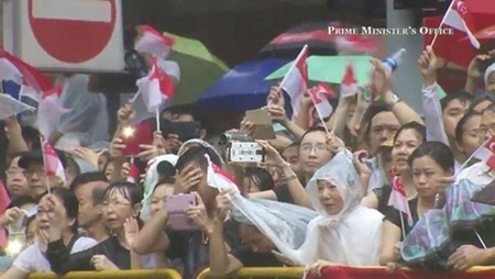 Người dân đội mưa và nhiều lần hô vang tên người cha lập quốc "Lý Quang Diệu, Lý Quang Diệu" khi đoàn xe đi qua. Ảnh: Straits Times |