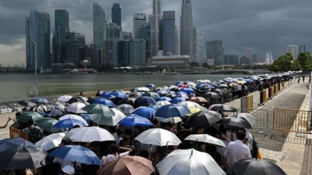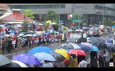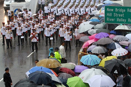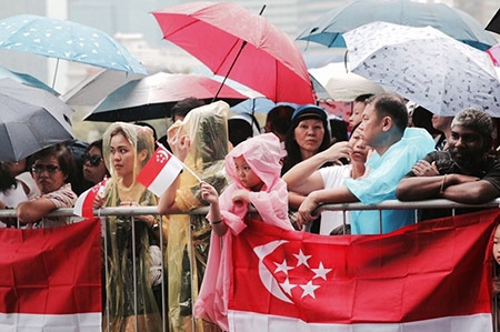 Quang cảnh người dân Singapore đưa tiễn người cha lập quốc dưới mưa. Ảnh: Straits Times |