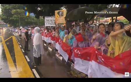 Người dân Singapore cầm quốc kỳ chờ đón linh cữu của cố thủ tướng Lý Quang Diệu đi qua. Người sử dụng mạng xã hội có tên Xchemstudent viết: "Cảm ơn Ngài Lý đã gây dựng đất nước Singapore. Chúng tôi yêu Singpore và kính yêu ông. Ông sẽ mãi ở trong lòng người dân". Ảnh: Channel News Asia |