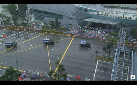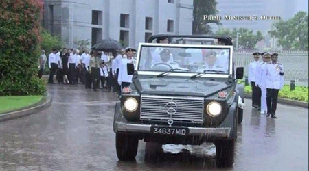 Đoàn xe chở linh cữu cố thủ tướng Singapore tiến về phía cổng tòa nhà Quốc hội. Ảnh: Straits Times |