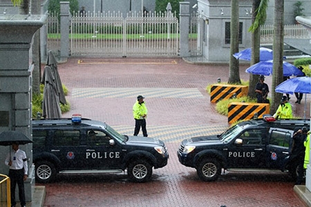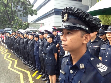 Các sĩ quan cảnh sát sẵn sàng làm nhiệm vụ trong ngày quốc tang của Singapore. Ảnh: Straits Times |