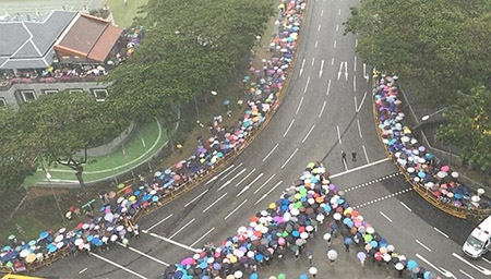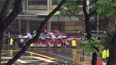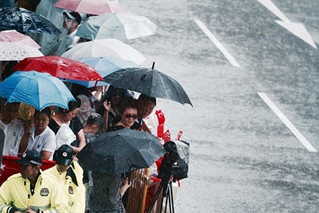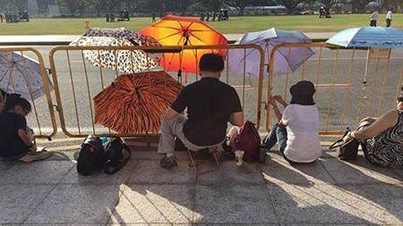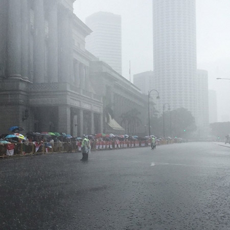 Người dân cầm ô và mặc áo mưa tại đường North Bridge và St Andrews một tiếng rưỡi trước khi tang lễ diễn ra. Ảnh: Straits Times |