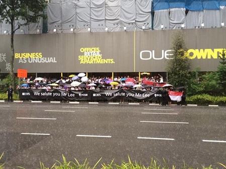 Dòng người tiễn đưa cố thủ tướng Singapore cầm dòng băng đen: "Kính cẩn tiễn đưa Ngài Lý Quang Diệu". Ảnh: Straits Times |