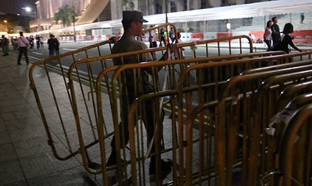 Từ sáng sớm, khoảng 1.000 sĩ quan của hai tiểu đoàn bộ binh Singapore đã tháo dỡ lều và dựng rào chắn khắp các con phố để bảo đảm an ninh trước khi tang lễ cựu Thủ tướng Lý Quang Diệu diễn ra. Ảnh: Channel News Asia |