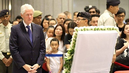 Cựu Tổng thống Mỹ Bill Clinton tỏ lòng tôn kính trước linh cữu cố thủ tướng Singapore tại tòa nhà Quốc hội hôm 28/3 ngay khi tới Singapore. Ảnh: Channel News Asia |