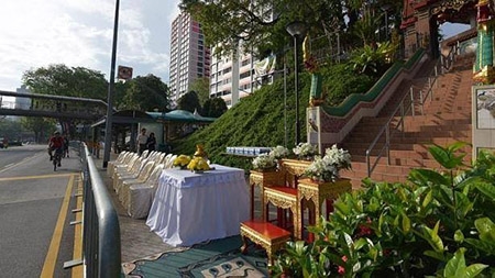 Tại chùa Phật giáo Thái Lan Wat Ananda Metyarama, một trung tâm tôn giáo của Singapore, ghế và hoa được chuẩn bị sẵn sàng cho tang lễ của ông Lý. Ảnh: Straits Times |