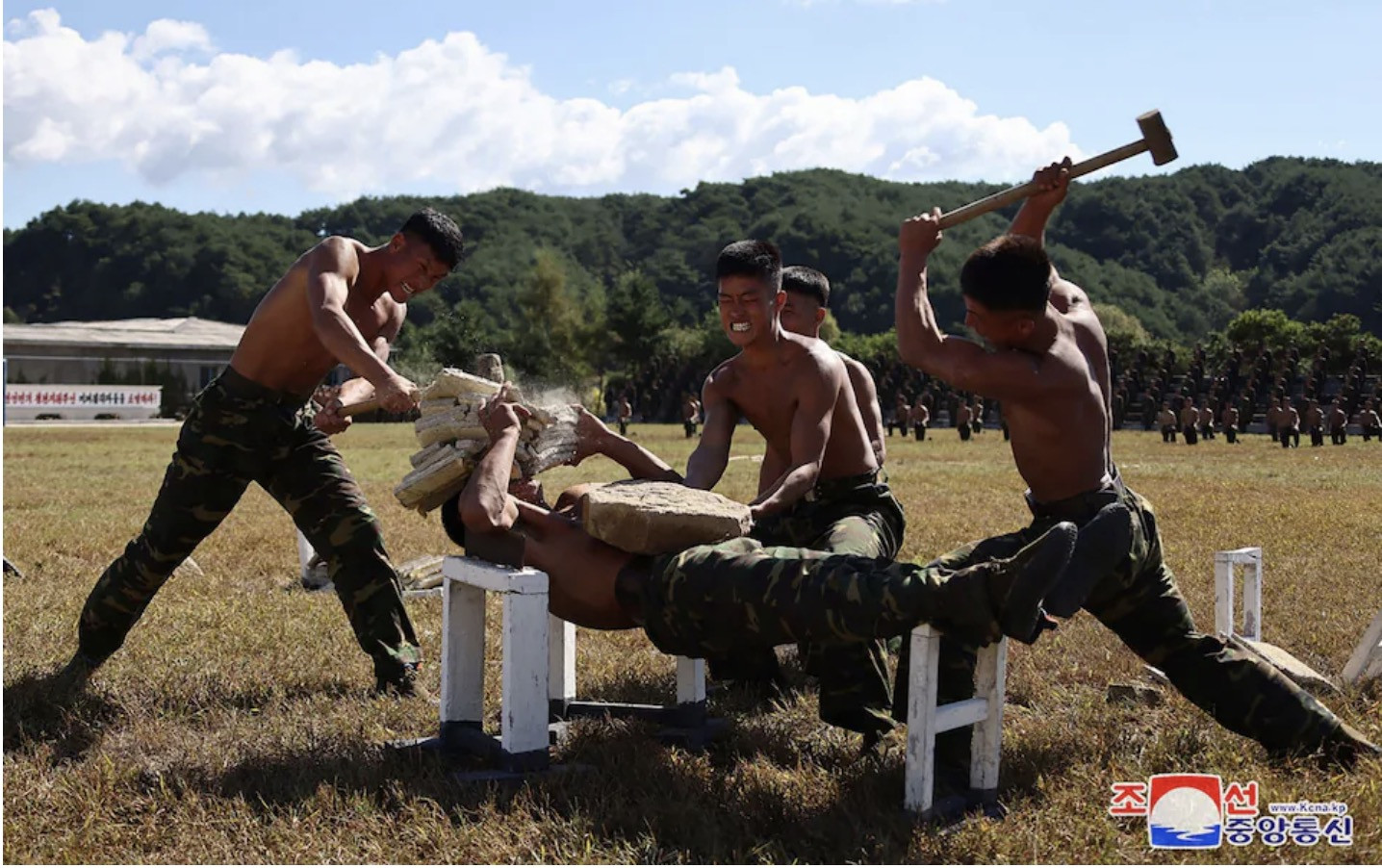 Theo Telegraph, các bức ảnh được chụp tại một địa điểm không được tiết lộ ở Triều Tiên, trong đó một binh sĩ nằm giữa những thanh chống nhỏ khi đồng đội vung búa để đập viên gạch đặt trên mặt và bụng anh ta. Một đội hình gồm những binh sĩ khác đang cởi trần, quỳ gối được thấy ở phía sau.