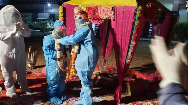Theo truyền thông, cô dâu và chú rể trong bộ đồ bảo hộ y tế màu xanh và đều đeo khẩu trang đã cử hành đầy đủ nghi lễ trước ngọn lửa thánh theo phong tục địa phương.