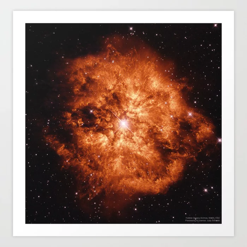 Ngôi sao Wolf-Rayet 124, nằm ở gần trung tâm hình ảnh, rộng khoảng sáu năm ánh sáng, tạo ra tinh vân xung quanh gọi là M1-67.