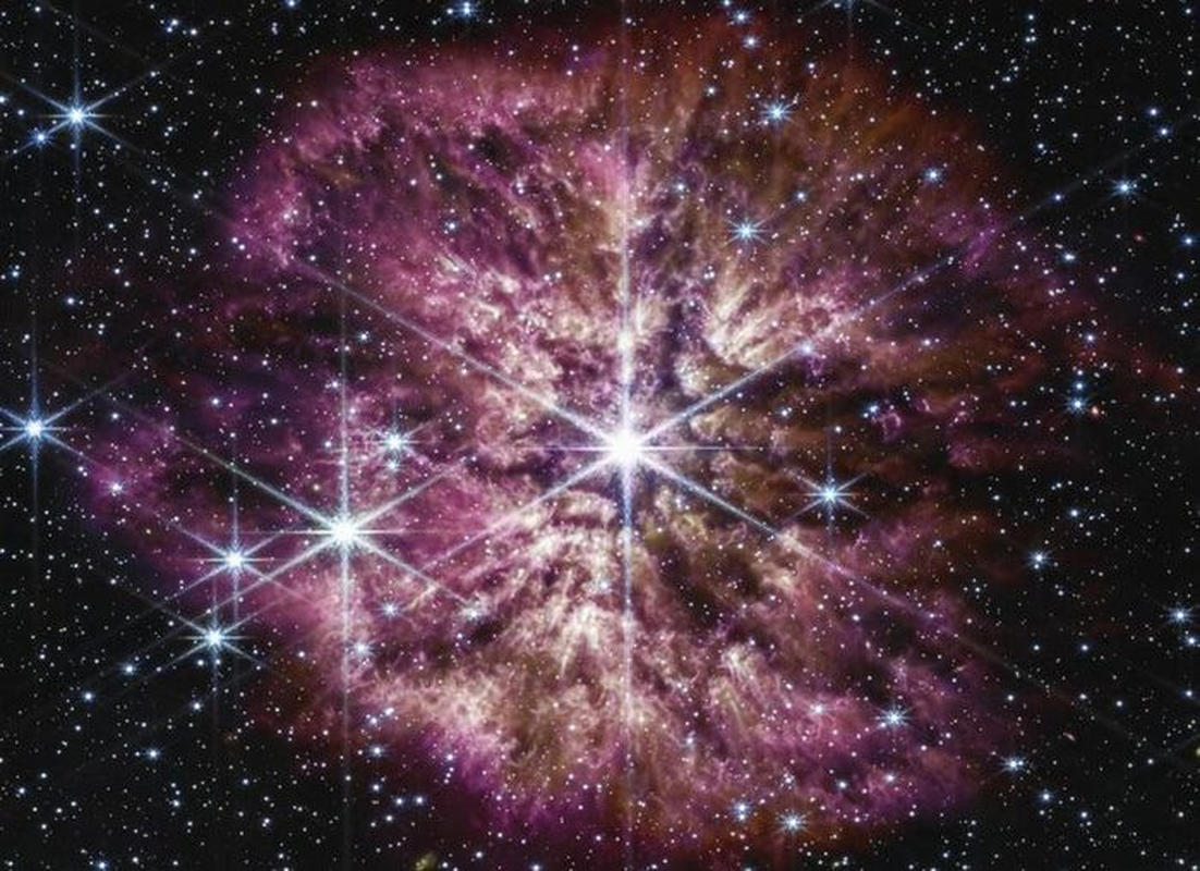 Mắt hồng ngoại của kính viễn vọng không gian James Webb đã quan sát được tất cả khí và bụi do một ngôi sao sắp chết mang tên Wolf-Rayet 124 tỏa vào không gian. Theo NASA, ngôi sao này trong chòm sao Nhân Mã, lớn gấp 30 lần Mặt Trời và đã phát ra đủ vật chất để tạo nên 10 Mặt Trời.