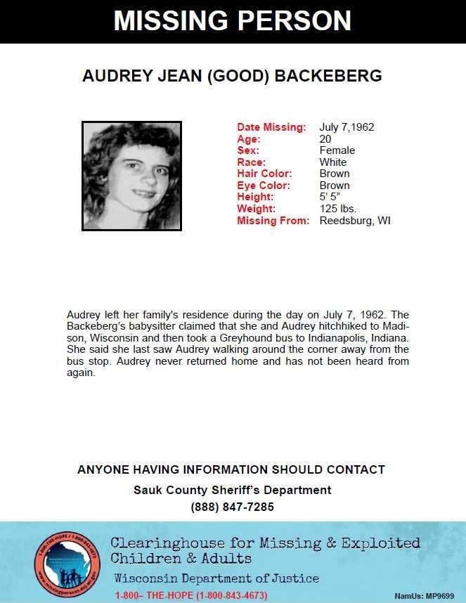 Vào ngày định mệnh năm 1962, Audrey Backeberg cùng với người giữ trẻ đã rời khỏi nhà ở hạt Sauk, Wisconsin. Họ đi nhờ xe đến Madison và sau đó lên chuyến xe buýt Greyhound hướng tới Indianapolis, bang Indiana. Người giữ trẻ đã chứng kiến Audrey rẽ qua một góc phố rời khỏi bến xe buýt và đó cũng là lần cuối cùng bà được nhìn thấy. Khi mất tích, Audrey mới chỉ 20 tuổi nhưng đã là mẹ của hai đứa con.