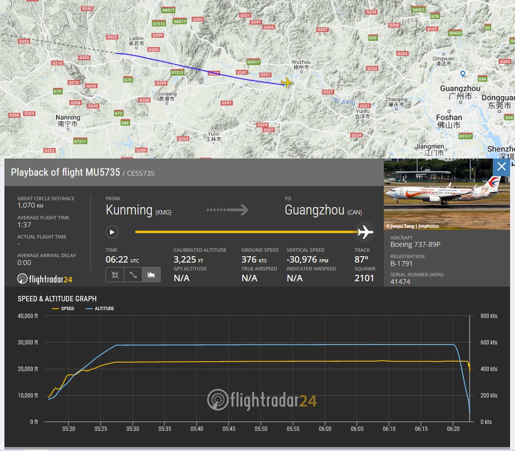 Máy bay gặp nạn bay ở độ cao 8.869 mét với vận tốc khoảng 845m/giờ sau khi cất cánh từ Sân bay Trường Thủy Côn Minh vào lúc 13 giờ 15. Máy bay sau đó bất ngờ hạ độ cao, hạ vận tốc vào lúc 14 giờ 19 phút, tín liệu radar ADS-B mất lúc 14 giờ 21, Global Times đưa tin.