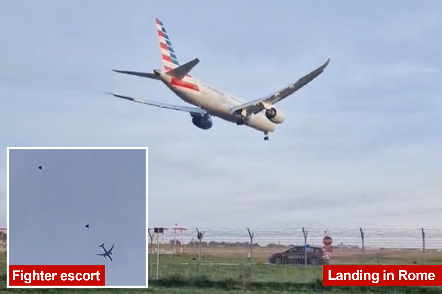 Những hình ảnh được chia sẻ trên mạng xã hội cho thấy chiếc Boeing 787-9 Dreamliner của American Airlines được 2 máy bay chiến đấu Eurofighter Typhoon của Không quân Italia theo sát trong quá trình hạ cánh.